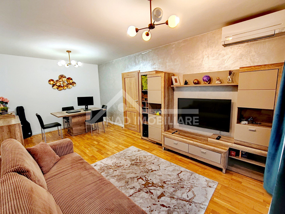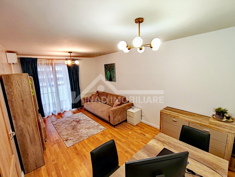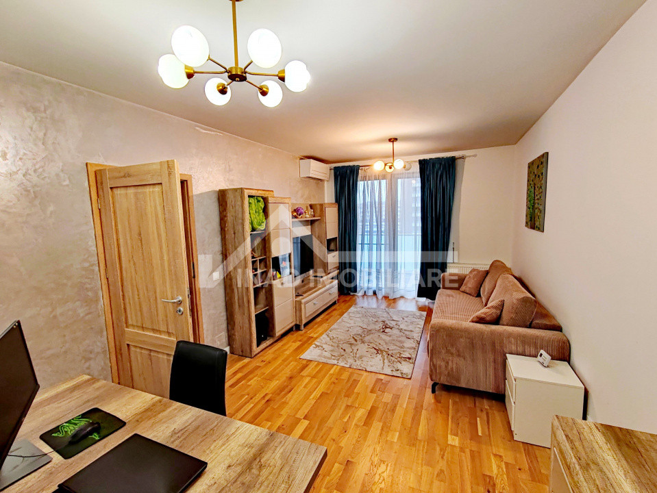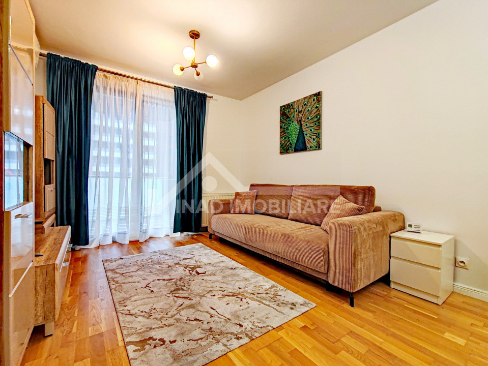 Va oferim oportunitatea de a inchiria acest apartament cu 2 camere, pozitionat la etajul 4 din 10 imobil cu doua lifturi, cu suprafata utila de 55mp, fiind compartimentat astfel: living cu canapea extensibila, bucatarie complet mobilata si utilata, dormitor cu pat matrimonial, baie cu cabina de dus, hol cu spatii de depozitare, balcon de 7 mp.