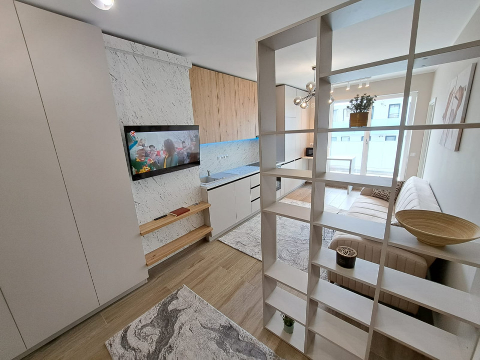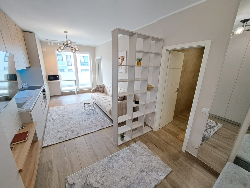 Apartamentul este situat la etajul 3, are suprafata utila de 45 mp, fiind compartimentat astfel: living cu bucatarie, dormitor, bai, balcon, hol, detine un loc de parcare in subsolul blocului.