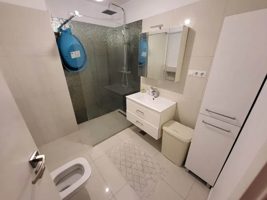 Apartamentul este situat la etajul 6, are suprafata utila de 58mp+ 14mp balcon, fiind compartimentat astfel: living cu bucatarie, dormitor, bai, balcon de aproximativ 14mp, detine si un loc de parcare in parcarea subterana a imobilului.
